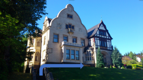 Treppe, die links vom Haus ist; am Ende der Treppe rechts.